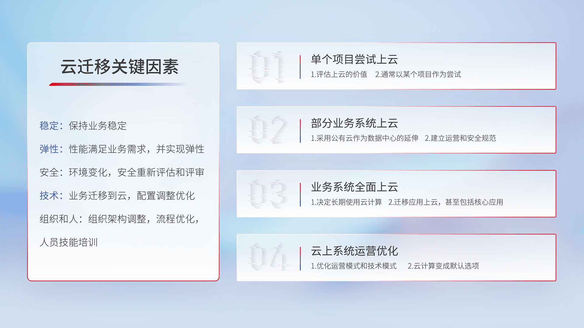 结合实际业务,,,从规划设计、、、、云平台选型、、、云原生改造、、、、数据迁移、、、集成交付,,,,迁移全过程为客户识别最佳上云路径,,,,做好风险识别管理,,设计网络架构、、、、身份权限、、安全审计合规、、、操作审计、、、日志审计、、、、监控告警策略、、、、多站点容灾设计等,,对云上基础设施进行整体规划,,,提升IT治理水平,,以满足弹性、、高可用、、高性能的需求。。。。