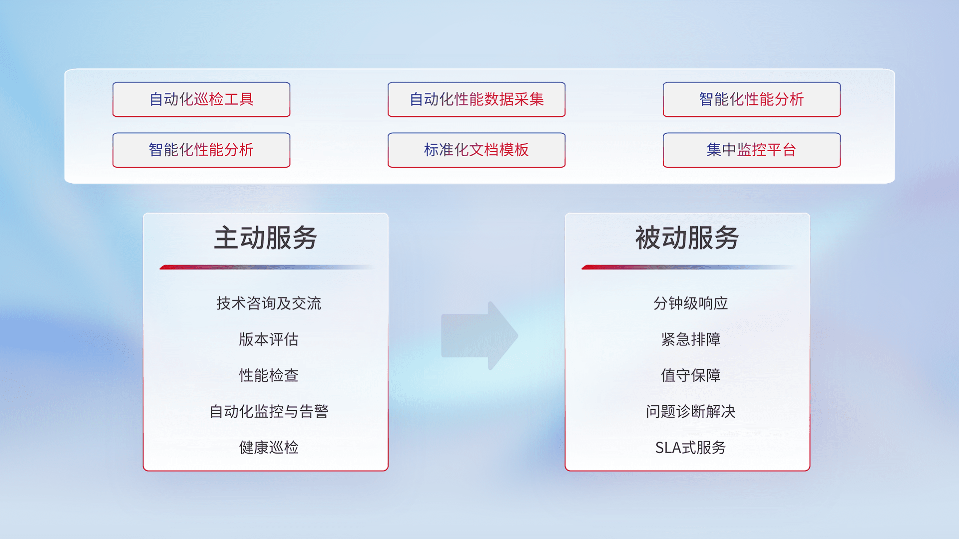 智能化工具和标准化文档,,,,保障服务质量,,,提供主动服务(包含技术咨询、、、、版本评估、、、、性能检查、、自动化监控与告警、、、、健康巡检)和被动服务包含(分钟级响应、、、、紧急排障、、、值守保障、、问题诊断解决、、、、SLA服务)。。。。