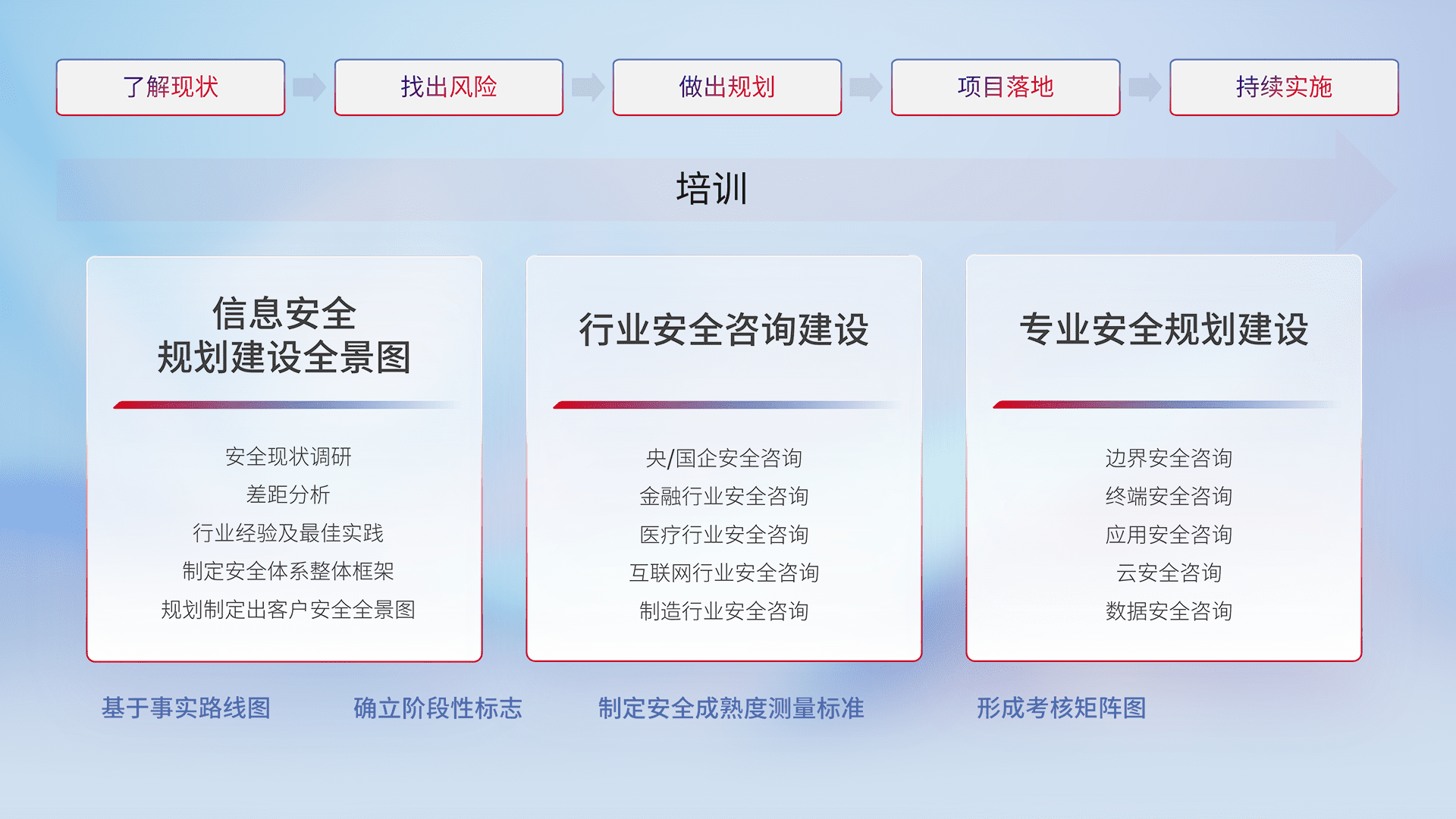 针对客户行业特性,,,以专业的安全服务+多厂商联合解决方案提供专属的一站式安全管理服务,,,,帮助客户全面感知网络空间威胁,,基于识别、、检测、、分析、、防护、、监测、、、响应的服务理论模型,,,,从方案咨询、、、集成交付、、、、评估验证、、优化加固、、运维运营,,,,致力于为客户提供完整的闭环管理式安全服务。。。。以实战经验为客户打造高抵御风险的安全体系,,,,帮助客户发现威胁、、、、对抗威胁、、、处置威胁,,不断积累安全对抗能力,,,持续保障数字化安全。。